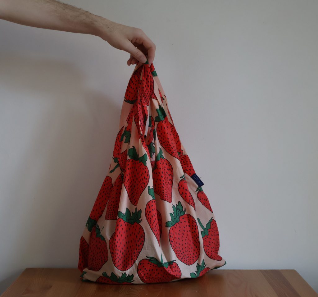 A standard Baggu bag is $14. It fits in your purse or even in your pocket. It carries 2-3 plastic grocery bags worth of groceries up to 40lbs comfortably in hand or over your shoulder. I don’t leave the house without one, since it hardly takes up any space, and now if I stop in a store on the way home spontaneously, I’m ready with a bag. The amount of bag costs I’ve avoided over the years by having a Baggu ready for an unforeseen shopping trip has more than paid off the cost of the bag.