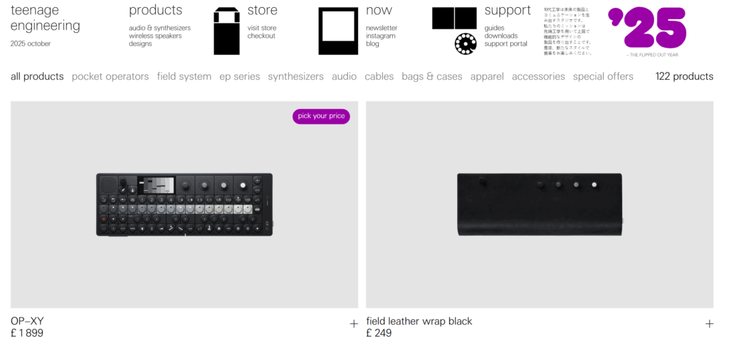 Okay, this is my one pick that’s a little more “out there” – Teenage Engineering is an audio/synthesizer brand that creates high quality luxury products to add to a bedroom music studio. Their brand is techy and also a bit silly. I’ve always liked shopping on their store because it really feels like you’re buying from a high-end company, with the large editorial images and thin font. Also, from a structure standpoint, I love how their header is structured like a dropdown menu without the actual dropdown mechanic. It feels bare-bones, like the user is in control to add the creativity layer, which is how their products feel when you use them.