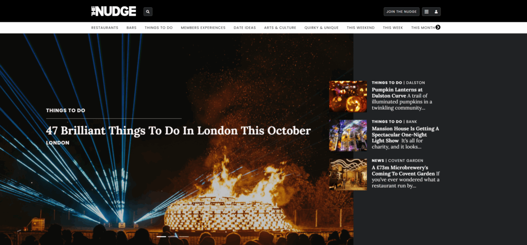 The Nudge is a trendy events service that lets you know of major happenings in large cities. Their website is a blend between thin sans-serif subheads and newsy serif headlines. I like how the styles they select emulate a newspaper, while also being updated and readable.